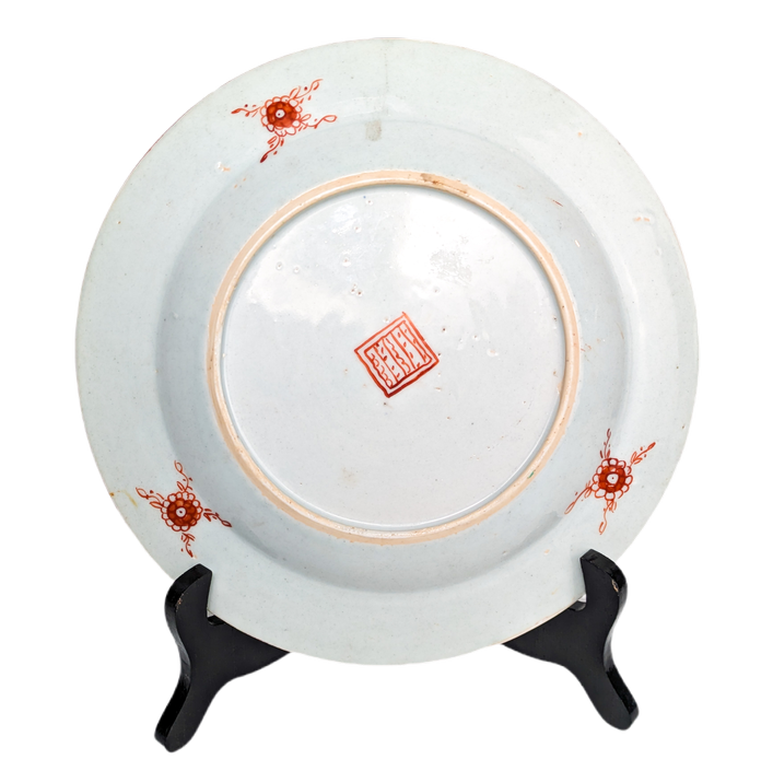 Plato Chino de porcelana pintada a mano de exportación de la Compania de las Indias a Inglaterra. Esta pieza data de la Dinastía Qing periodo Kangxi (1662-1722) cuando este tipo de porcelana era producida para la exportación a Europa. El término clobbered se utiliza para este tipo de piezas chinas que han sido pintadas posteriormente siglos después en Europa, en este caso la parte que fue redecorada por artesanos europeos es el medallón verde, rojo y amarillo con los dragones y detrás la marca. La parte de original es la azul y naranja. La marca que hay detrás no tiene un significado, es únicamente decorativa. La presencia de dragones en la decoración hace esta pieza más única, estos son dragones pintados por europeos tratando de imitar los dragones chinos. La razón por el que hacían este clobbered en la época es porque les ayudaba a venderlas mejor, los comerciantes contrataban a artesanos para que hagan el repintado y luego estos podian venderlos a un precio superior/ Medidas: 23cm x 23cm x 2,5cm.